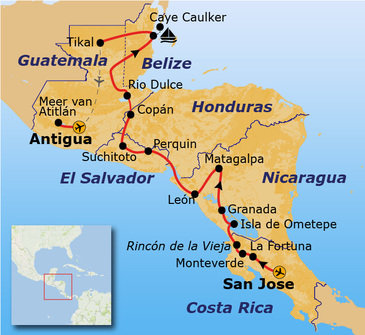 Tijdens deze rondreis door Costa Rica, Nicaragua, El Salvador, Honduras, Belize en Guatemala beleef je de geheel eigen sfeer van zes landen in Midden-Amerika. Costa Rica is met zijn tropische regenwouden en onvoorstelbare variëteit aan dieren de tuin van Midden-Amerika. Nicaragua biedt prachtige meren en sfeervolle plaatsen en El Salvador biedt sfeervolle koloniale steden en vulkanen. In Guatemala en Honduras ligt de oorsprong van de Maya-cultuur, met indrukwekkende ruïnes en authentieke indianendorpen en in Belize tref je een bijzonder relaxte sfeer, mooie stranden en geweldige snorkelmogelijkheden.